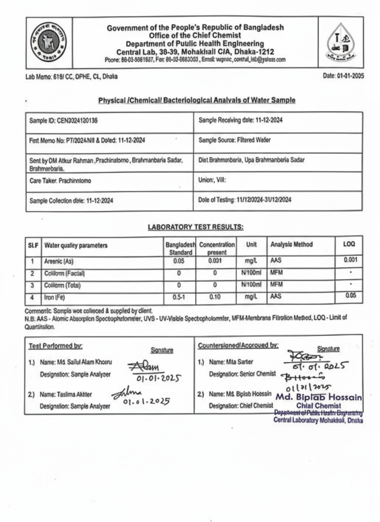 Public Health Engineering (DPHE) এর ল্যাব টেস্টে প্রমাণিত এটি নিরাপদ ও বিশুদ্ধ পানি প্রধান করে
